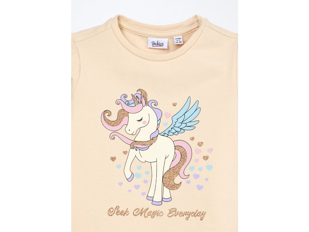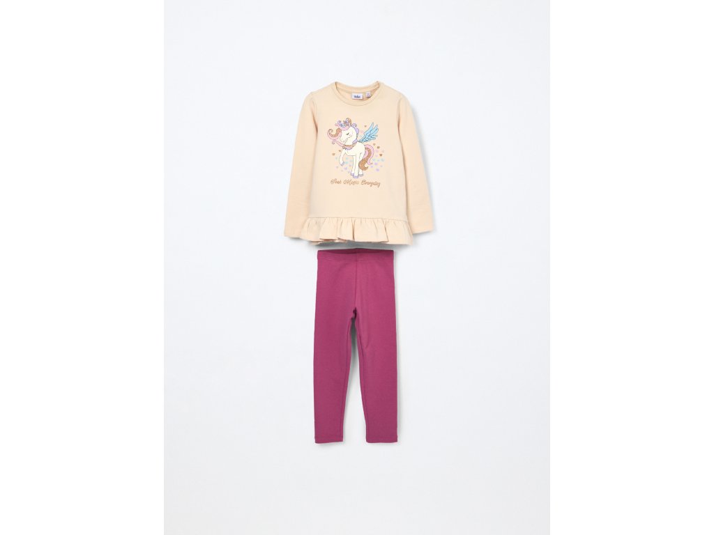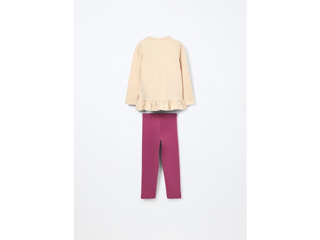 Běžecká souprava z elastického bavlněného fleecu se třpytivým potiskem na přední straně. Kulatý výstřih a volán na spodní straně. Legíny s pružným pasem v jednobarevném provedení.MATERIÁLY: 96 % BAVLNA, 4 % ELASTAN