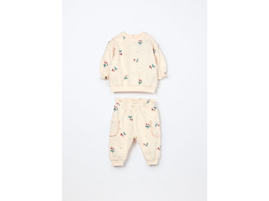 Joggingová souprava z čisté bavlny s celoplošným květinovým potiskem. Vrchní část s výstřihem a žebrovaným lemem. Zapínání na patentky na zádech. Elastické manžety. Kalhoty s pasem typu "papírový sáček" a žebrovanými manžetami. Dvě zpracované přední kapsy.