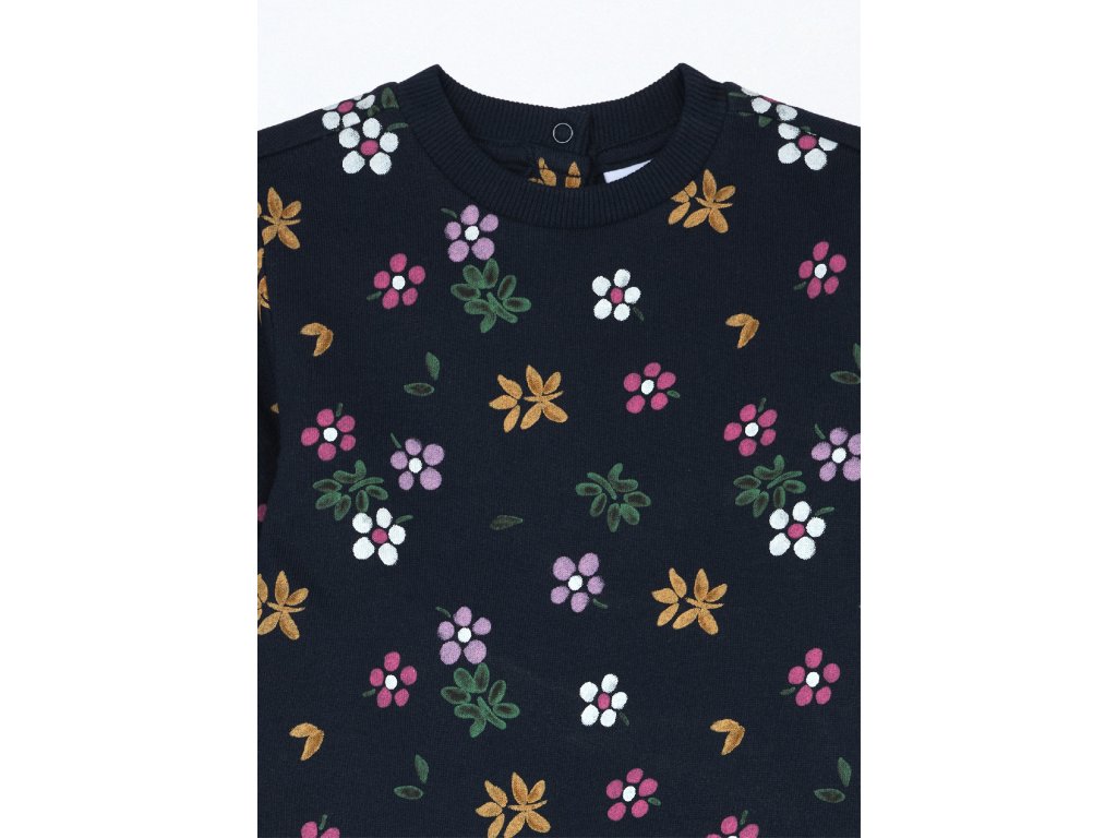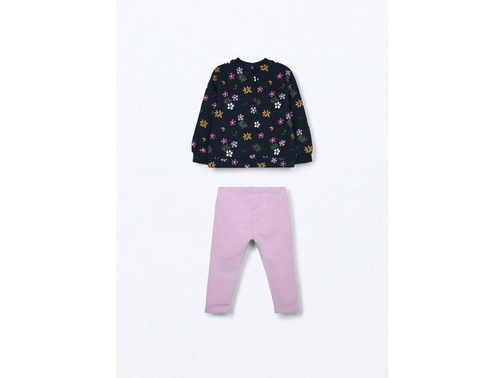 Joggingová souprava z čistého bavlněného fleecu sestávající z horního dílu s celoplošným květinovým potiskem. Žebrovaný výstřih a manžety. Zapínání na patentky na zádech. Legíny s elastickým pasem, jednobarevné.