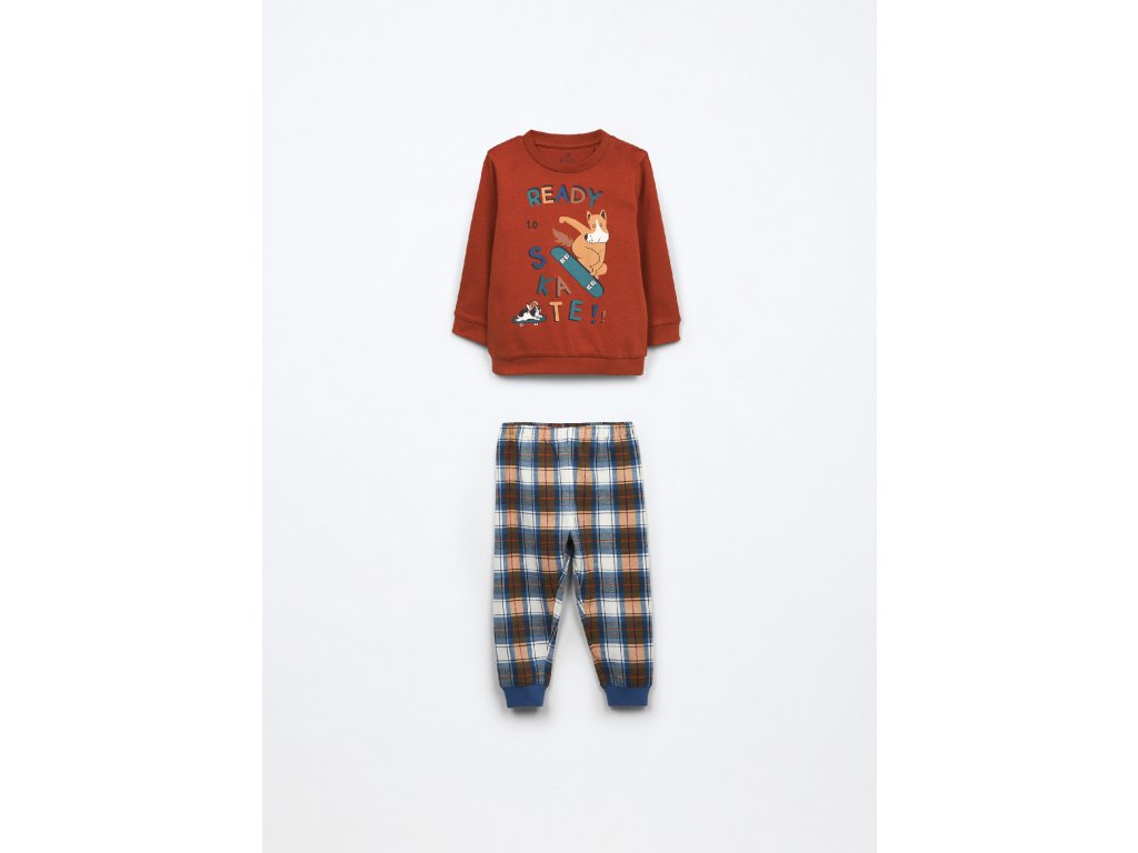 Pyžamová souprava z čisté bavlny interlock se skládá z vrchního dílu s výstřihem a celoplošným potiskem. Zapínání na knoflíky na rameni. Kalhoty s kostkovaným vzorem a pružným pasem.MATERIÁL: 100% BAVLNA