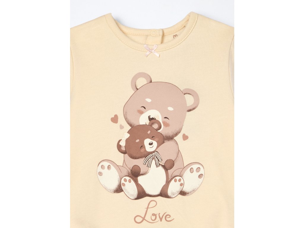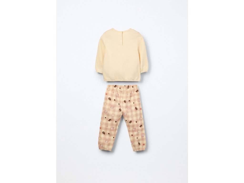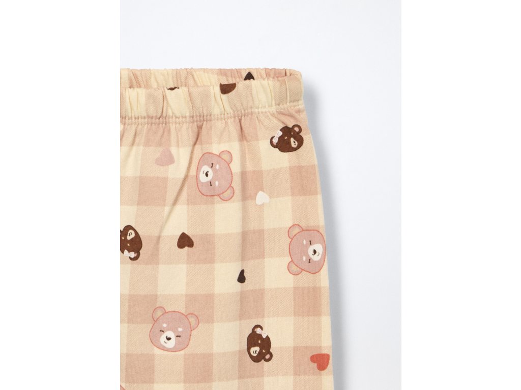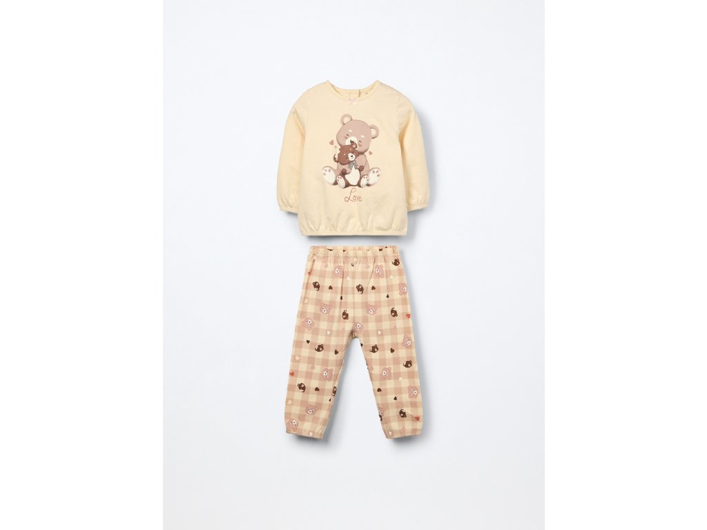 Dlouhá pyžamová souprava z bavlněného fleecu, která se skládá z trička s výstřihem a potiskem na přední straně a zapínáním na patentky na zadní straně. Spodní lem a manžety jsou elastické. Kostkované kalhoty s celoplošným potiskem. Pružný pas a manžety.