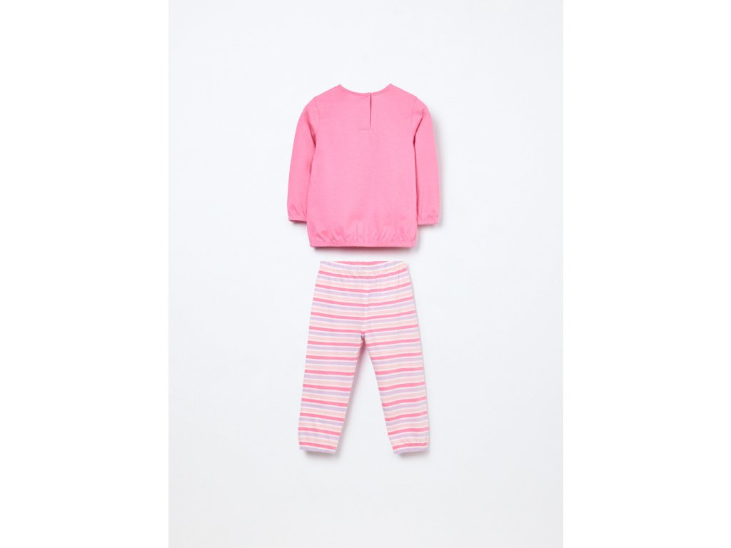Dlouhá pyžamová souprava z čistě bavlněného žerzeje. Horní díl s potiskem na přední straně. Kulatý výstřih a dlouhé rukávy. Zapínání na patentky na zádech. Elastický spodní lem a manžety. Kalhoty pruhované, s elastickým pasem.
