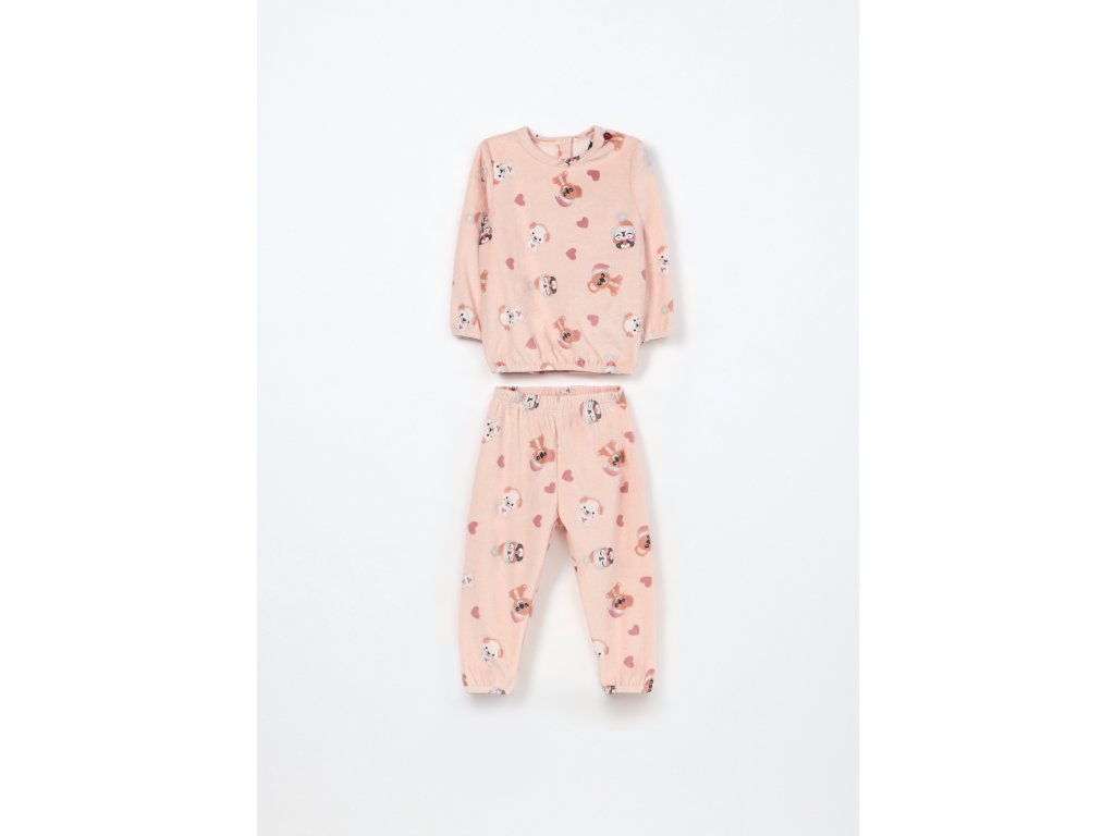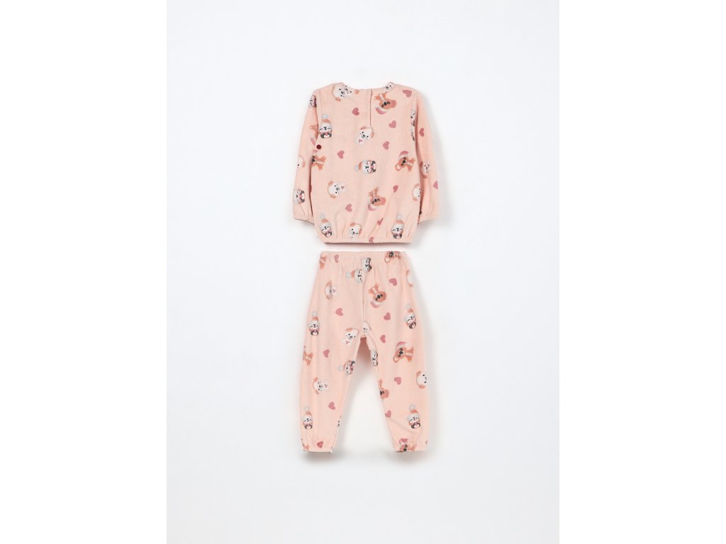 Pyžamová souprava z velurové bavlněné příze s celoplošným potiskem se skládá z vrchního dílu s kulatým výstřihem a zapínáním na patentky na zádech. Elastické manžety a spodní lem. Kalhoty s elastickým pasem a manžetami.