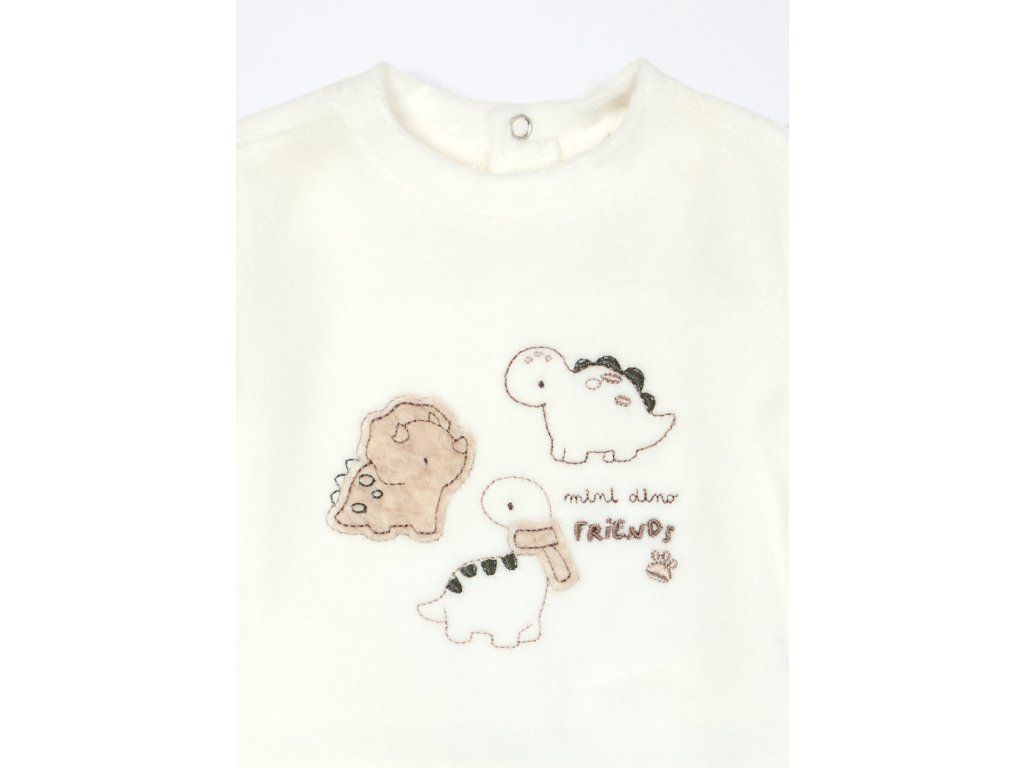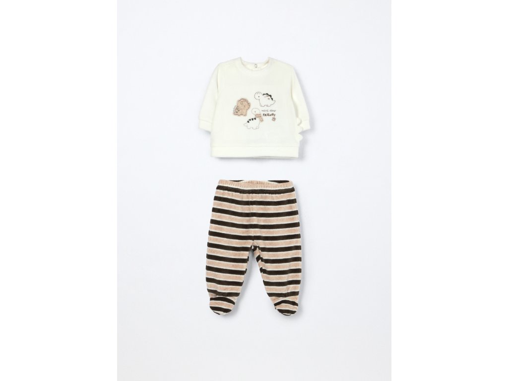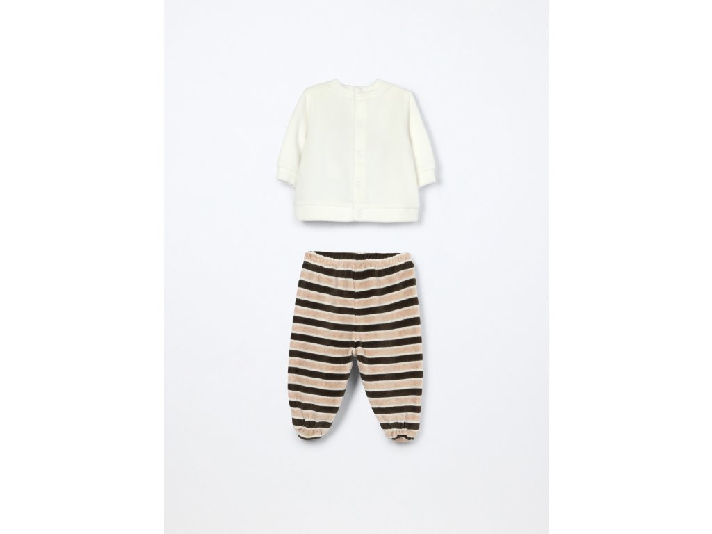 Souprava z bavlněného veluru. Tričko s kulatým výstřihem a dlouhými rukávy. 3D nášivky a aplikace na přední straně. Zapínání na patentky na zádech. Kalhoty s ťapkami pruhované, elastický pas.