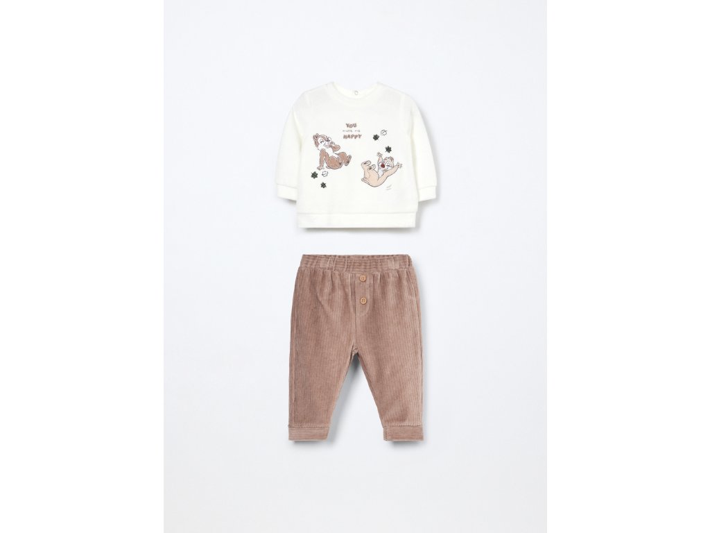 Souprava z bavlněného veluru sestávající z topu s aplikovanými nášivkami a výšivkou Disney. Kulatý výstřih se zapínáním na knoflíky na zádech. Dlouhé rukávy. Kalhoty s pružným žebrovaným pasem. Jednobarevné provedení.MATERIÁL: 75 % BAVLNA, 25 % POLYESTER