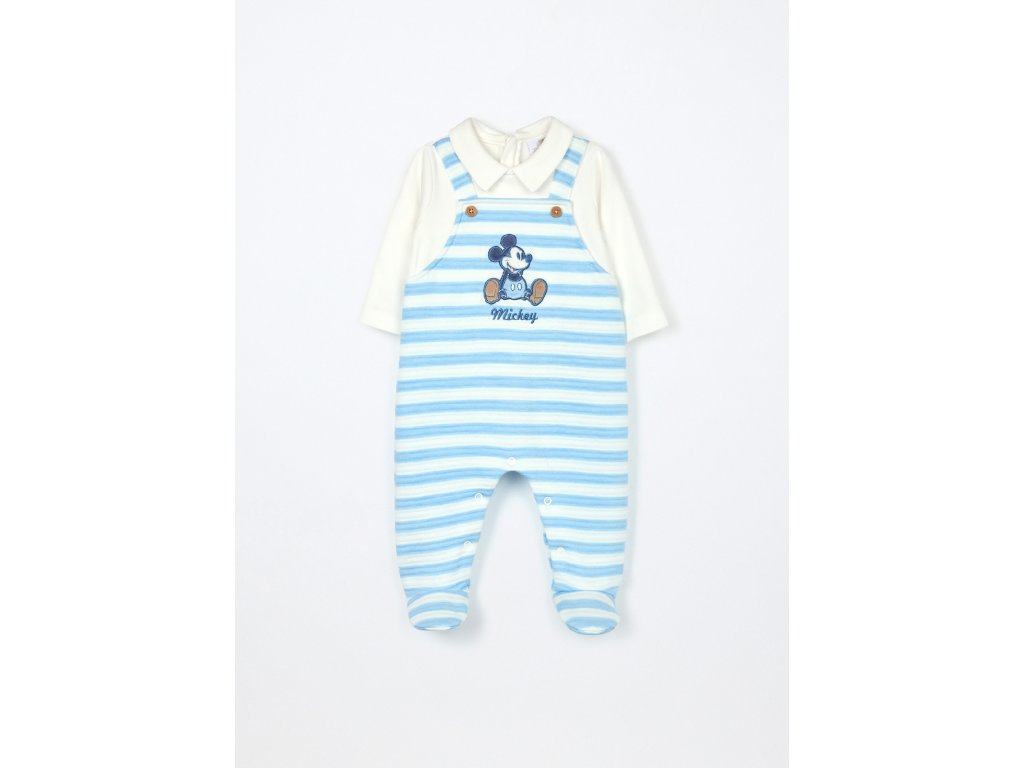 Overal z bavlněné příze matelassa s francouzským límcem a zapínáním na zip na zádech. Dupačky s pruhovaným vzorem a výšivkou Disney na přední straně. Zapínání na patentky v rozkroku.